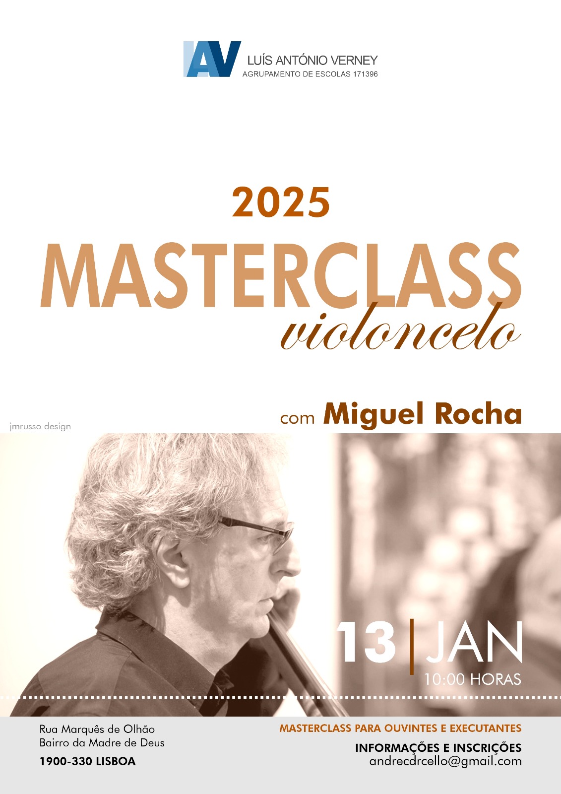 É com enorme satisfação que a Escola Básica e Secundária Luís António Verney recebe o Professor Miguel Rocha para a realização de uma Masterclass de Violoncelo.